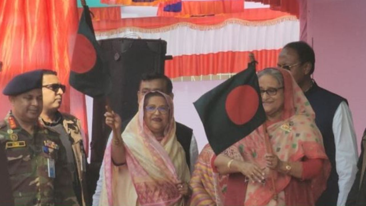 গোপালগঞ্জের টুঙ্গিপাড়ায় জনসভায় শেখ হাসিনা ও তাঁর বোন শেখ রেহানা।